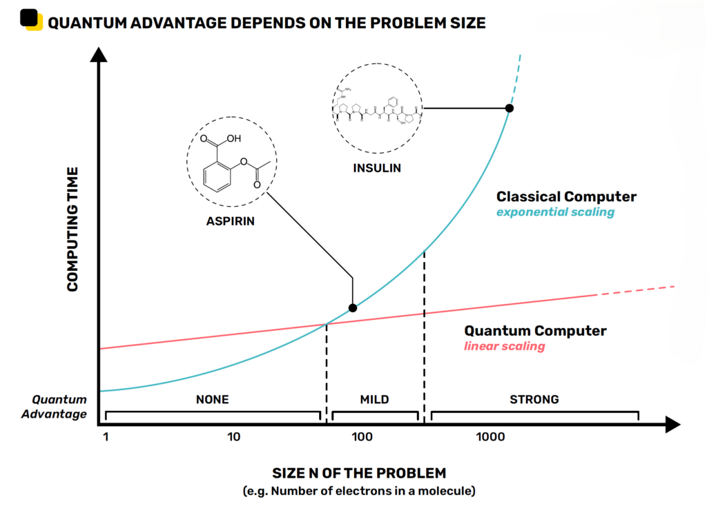 In the image below there is represented the previously cited difference in scaling between quantum and classical computing with a focus on chemical problems.