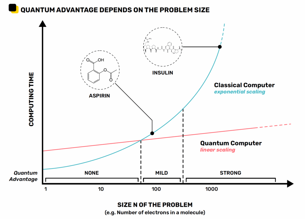 Nell’immagine sottostante è rappresentata la differenza di scalabilità precedentemente citata tra informatica quantistica e classica con un focus sui problemi chimici.